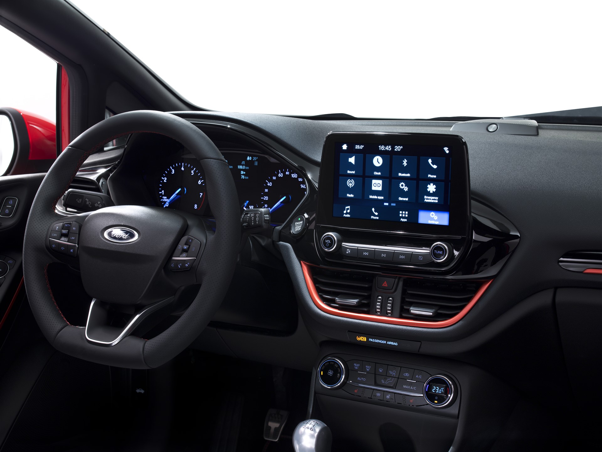 - sistem de infotainment SYNC 3, compatibil cu Apple CarPlay şi Android Auto. Acesta oferă și funcția SYNC AppLink, care permite activarea prin voce a anumitor aplicații de pe smartphone. SYNC 3 poate afișa informațiile pe ecrane tactile de până la 8 inch în diagonală. Conectivitatea este asigurată prin bluetooth și 2 x USB, în timp ce toate versiunile Fiesta aduc sistem radio DAB;