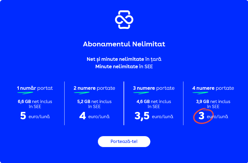 Digi Mobil desfăşoară în prezent campania promoţională „Acelaşi număr, mai mult confort”, una care oferă reduceri de preţ la abonamentul Optim Nelimitat atunci când sunt portate mai multe numere de telefon (cel mai ieftin se ajunge la 3 euro / lună cu 4 numere portate). Mare atenţie însă că la fiecare scădere de preţ, scade şi disponibilul de internet mobile inclus în roaming (6.6 GB la 1 număr, 5.2 GB la 2 numere, 4.6 GB la 3 numere şi 3.9 GB la 4 numere).