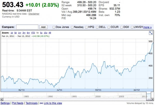 Astăzi acţiunile Apple au trecut de valoarea de 500 de dolari. În sesiunea de trading din cadrul bursei americane, o acţiune a companiei Apple a devenit mai scumpă decât cea mai ieftină tabletă iPad 2 Wi-Fi disponibilă în magazinul companiei. Este cel mai mare preţ al unei acţiuni Apple din istorie şi se pare că în curând valoarea capitalizării bursiere a companiei va depăşi cifra de 500 de miliarde de dolari.
