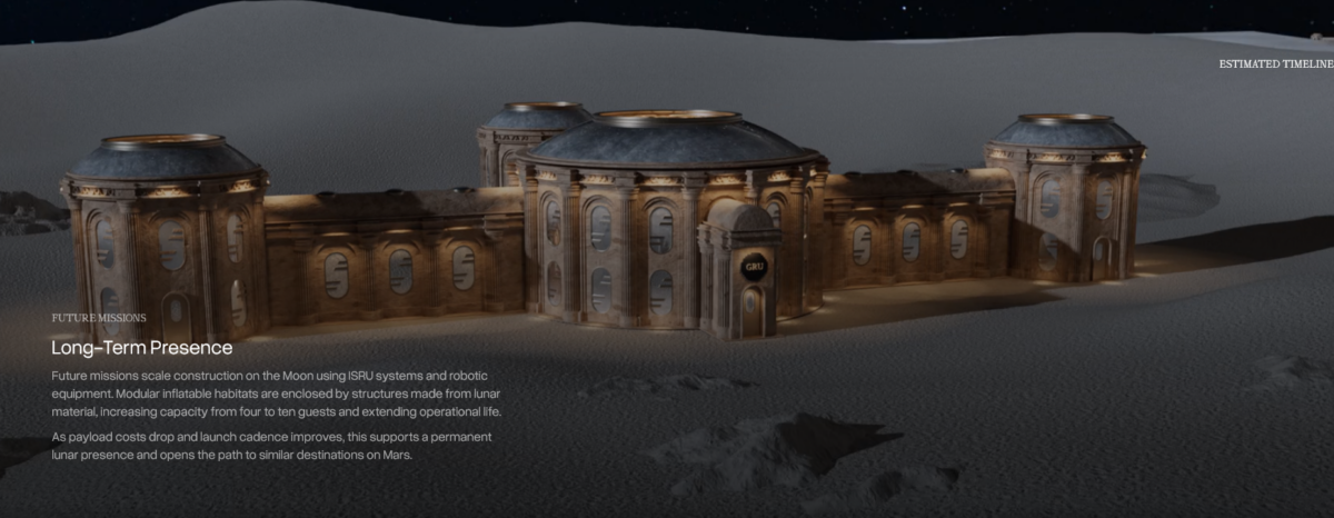 GRU Space este un start-up cu ambiţii puţin cam mari. Compania fondată de un tânăr absolvent al Universităţii California din Berkely îşi doreşte ca până în 2032 să ridice o structură gonflabilă capabilă să găzduiască patru persoane simultan, iar ulterior să treacă le next level şi să construiască o structură permanentă, una fabricată din materiale obţinute chiar de pe Lună.
