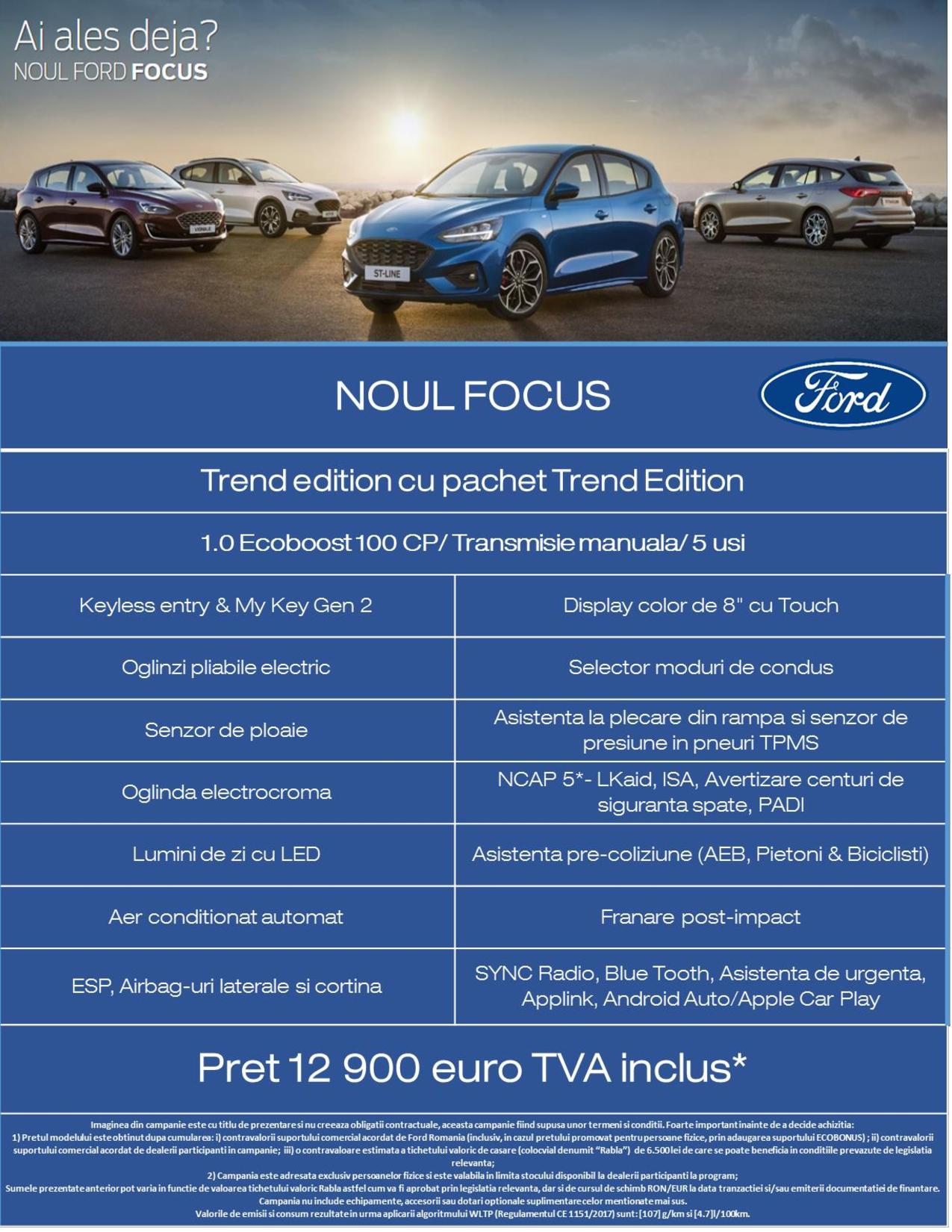 Totuși, oferta de lansare pentru noul Ford Focus în echiparea și cu motorizarea specificate mai sus presupune un preț de numai 12.900 euro cu TVA, prin programul Rabla. În această sumă sunt oferite dotări standard precum aer condiționat automat, ecran color tactil de 8 inch, SYNC Radio cu Bluetooth, asistență de urgență, Applink, Android Auto și Apple Car Play, keyless entry și My Key Gen. 2, asistență precoliziune și frânare post-impact, senzori de ploaie ș.a.