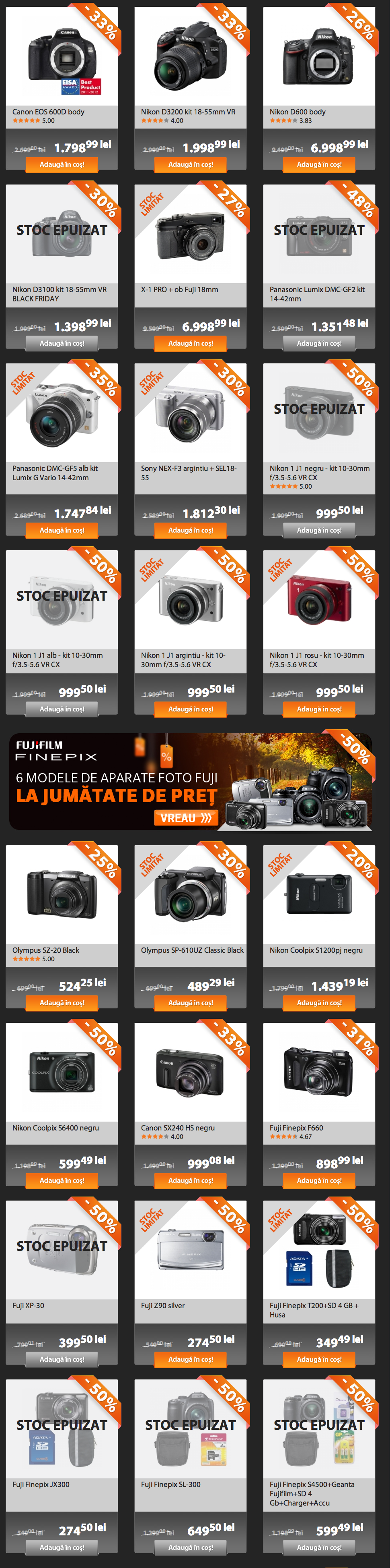 Astăzi, 23 noiembrie 2012, la ora 00:00, sute și mii de români au luat cu asalt site-urile magazinelor online ce au promis reduceri de Black Friday. Din păcate, majoritatea nu au rezistat numărului de accesări. După 2 ore, încet, încet câteva site-uri au reușit să își revină. Unul dintre aceste site-uri este F64. Vedeți oferta lor de produse în cadrul evenimentului Black Friday, mai jos. Grăbiți-vă, stocurile se epuizează rapid iar ofertele sunt cu adevărat generoase!