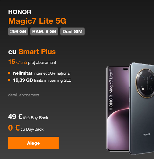 Aceasta spune că la portarea din altă reţea poţi alege smartphone-ul Honor Magic7 Lite cu 8 GB RAM şi 256 GB stocare la 49 euro / lună fără Buy-Back cu abonamentul Smart Plus ce costă 15 euro / lună.