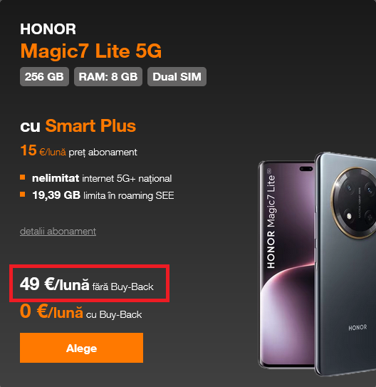 - preţul telefonului reieşit după cele 24 de luni contractuale (deşi am observat că ratele practicate mai nou de Orange se duc pe 36 de luni) ar ieşi de 1176 euro, adică undeva la 5850 lei (ori un Honor Magic7 Lite costă la liber undeva la 1500 – 1600 lei);