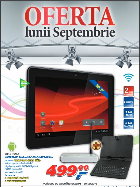 Overmax România împreuna cu Real Hypermarket ne oferă în luna septembrie o ofertă de nerefuzat. Pentru doar 499 de lei puteţi achiziţiona o tabletă de 10.1 inch + tastatură cu husă + router wireless. Pentru cei care nu ştiu, Overmax este o firma poloneză care branduieşte ceva tablete chinezeşti şi apoi le vinde la preţuri mult mai mici decât firmele cu renume ( ceva de genul Allview sau E-boda în ţara noastră ).