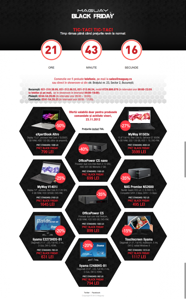 Cei de la Maguay nu au un coș de cumpărături pe site, se poate comanda de obicei doar prin cerere de ofertă, telefonic sau prin e-mail. Se poate totuși ca de Black Friday să fie mai rentabilă această variantă. Reducerile sunt valabile doar astăzi – vineri, 23.11.2012 și doar sub condiția achitării în această zi. Din păcate avem doar 9 reduceri disponibile și nici acestea nu prea avantajoase. Ce părere aveți?