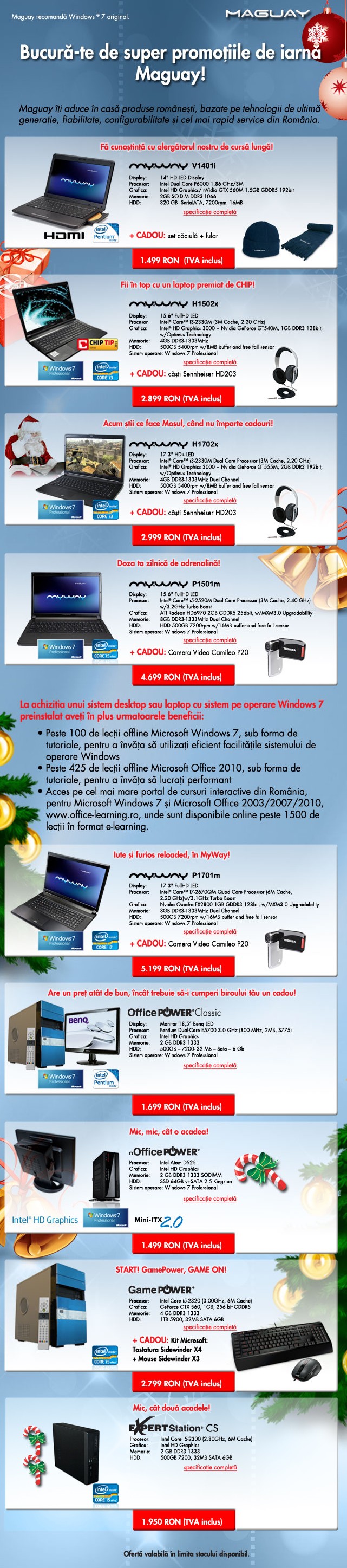 Maguay este un brand local de portabile care are planuri mari pentru 2012: un ultrabook şi o tabletă cu Windows 8. Nu au oferit detaliile oficiale şi sunt la nivelul de zvon în acest moment, nu există o poziţie oficială. Vom vedea în 2012 despre ce este vorba. Mai jos găsiţi oferta lor pentru luna cadourilor şi s-ar putea să daţi de ceva interesant. Din punctul meu de vedere aş merge pe mâna unui Maguay MyWay H1502x. Nu l-am avut pentru review în 2011, dar lista de specificaţii şi preţul par a fi ok: