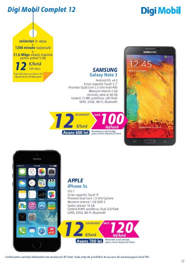 3. Samsung GALAXY Note 3 – 600 lei + rată de 100 lei / 24 luni + abonament Digi Mobil Complet 12 / 12 euro pe lună;