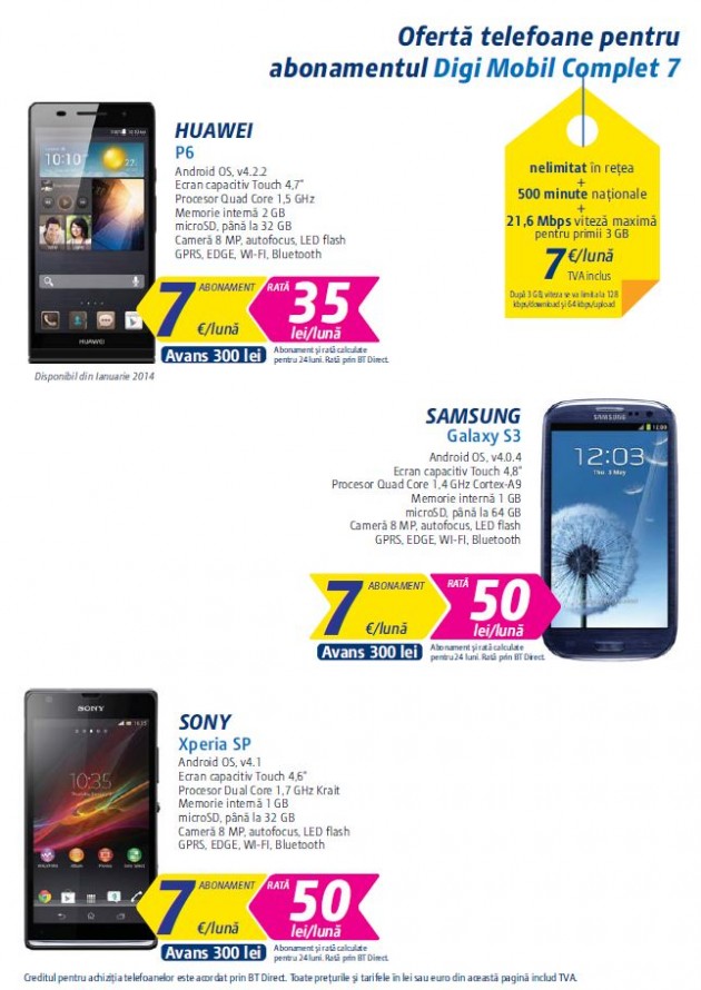 Telefoanele pot fi achiziționate în rate prin Banca Transilvania pe diverse perioada contractuale: 12 sau 24 luni. Pentru a achiziționa un smartphone subvenționat trebuie ales un abonament din categoria Digi Mobil Complet (plajă de costuri situată între 2 și 12 euro).