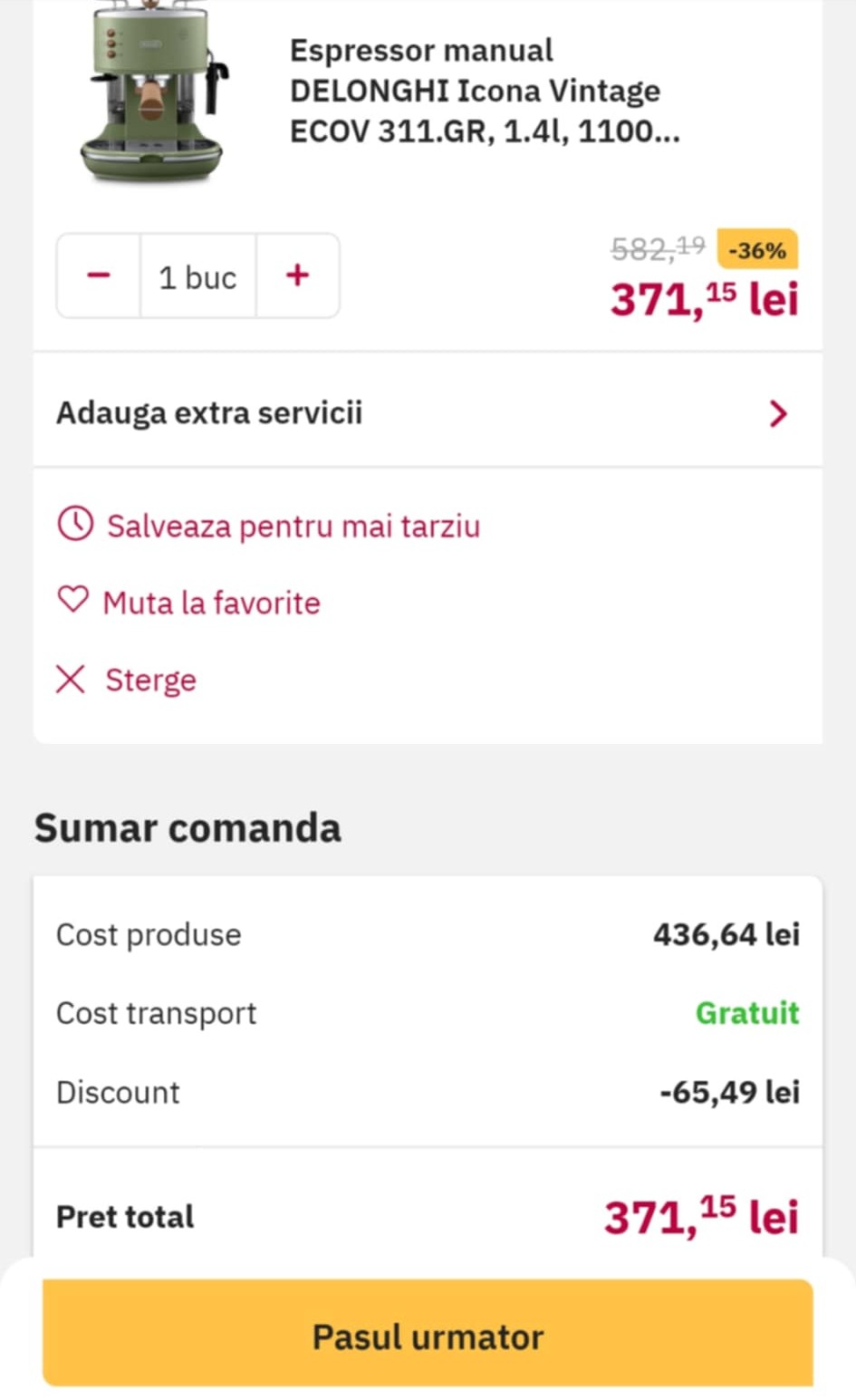 Pentru a beneficia de acest preţ foarte bun, trebuie să intraţi pe aplicaţia mobile a celor de la Altex, să selectaţi acest model, să îl adăugaţi în coş, iar la final să aplicaţi codul DELONGHI15APP (acesta este disponibil deja în secţiunea “adaugă extra cupoane”). Important de menţionat este că acest preţ este valabil doar cu ridicare din magazin (dacă îl vreţi livrat acasă va trebui să mai scoateţi din buzunar încă 14.90 de lei).