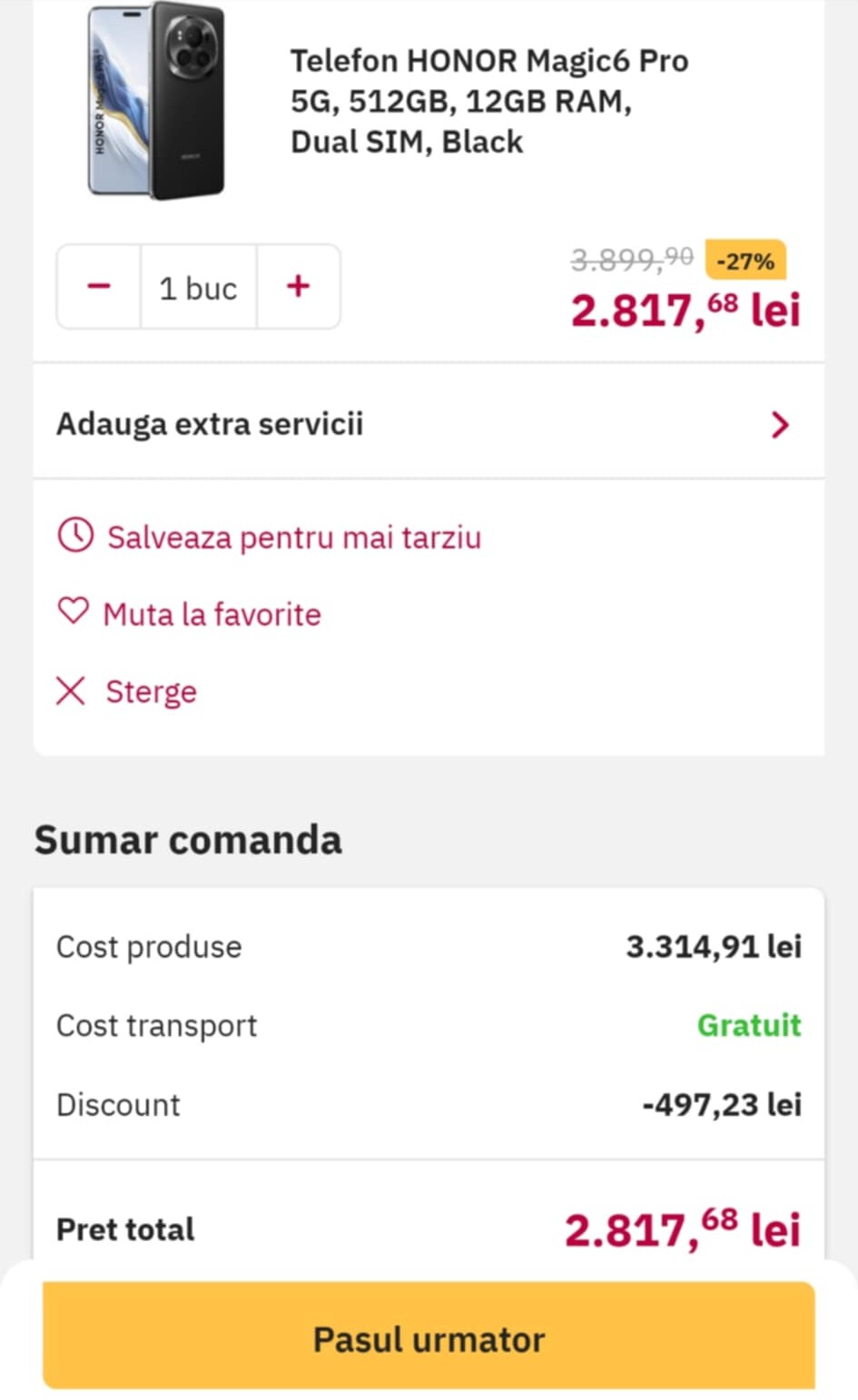 Până pe 14 iulie inclusiv sau în limita stocului disponibil, puteţi achiziţiona un Honor Magic6 Pro cu 12 GB RAM, 512 GB stocare, baterie de 5600 mAh şi procesor premium pentru doar 2817.68 lei. Aţi citit bine, este un cost de smartphone mid-range ceva mai răsărit.