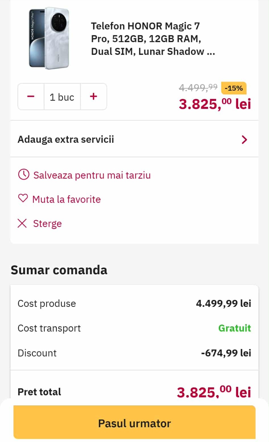 Acest telefon este Honor Magic7 Pro, cel care primeşte o reducere de 15% în aplicaţia mobile a celor de la Altex prin aplicarea codului cupon SMART15APP. Preţul standard este de 4499.90 lei, iar prin aplicarea codului vei plăti un preţ final de 3825 lei. Transportul este gratuit.
