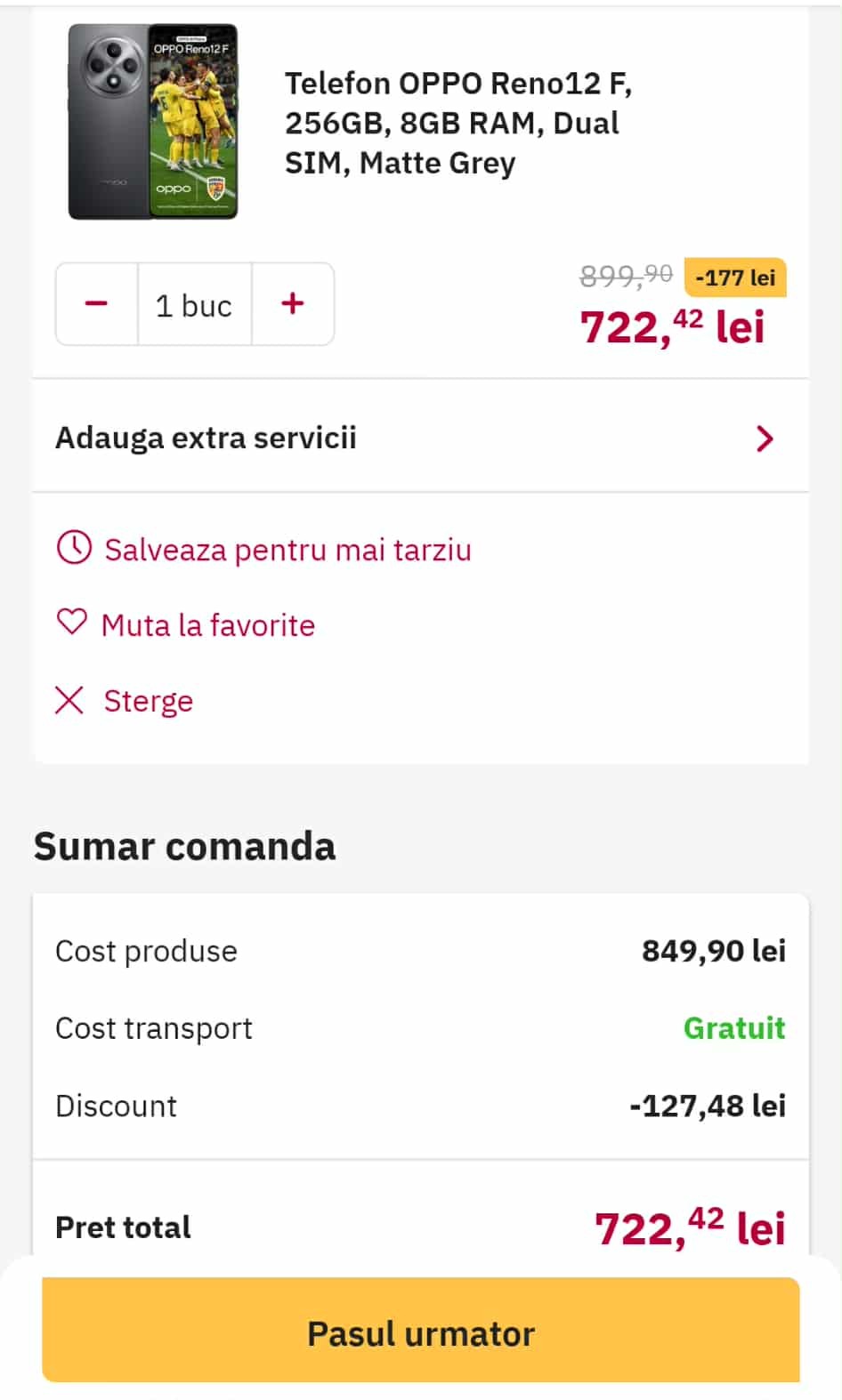 Pentru a beneficia de acest preţ, trebuie să intraţi în aplicaţie, să alegeţi smartphone-ul, să îl adăugaţi în coşul de cumpărături, să aplicaţi codul cupon OPPO15APP (acesta este disponibil deja în secţiunea “adaugă extra cupoane”) şi la final să trimiteţi comanda. Atât de simplu.