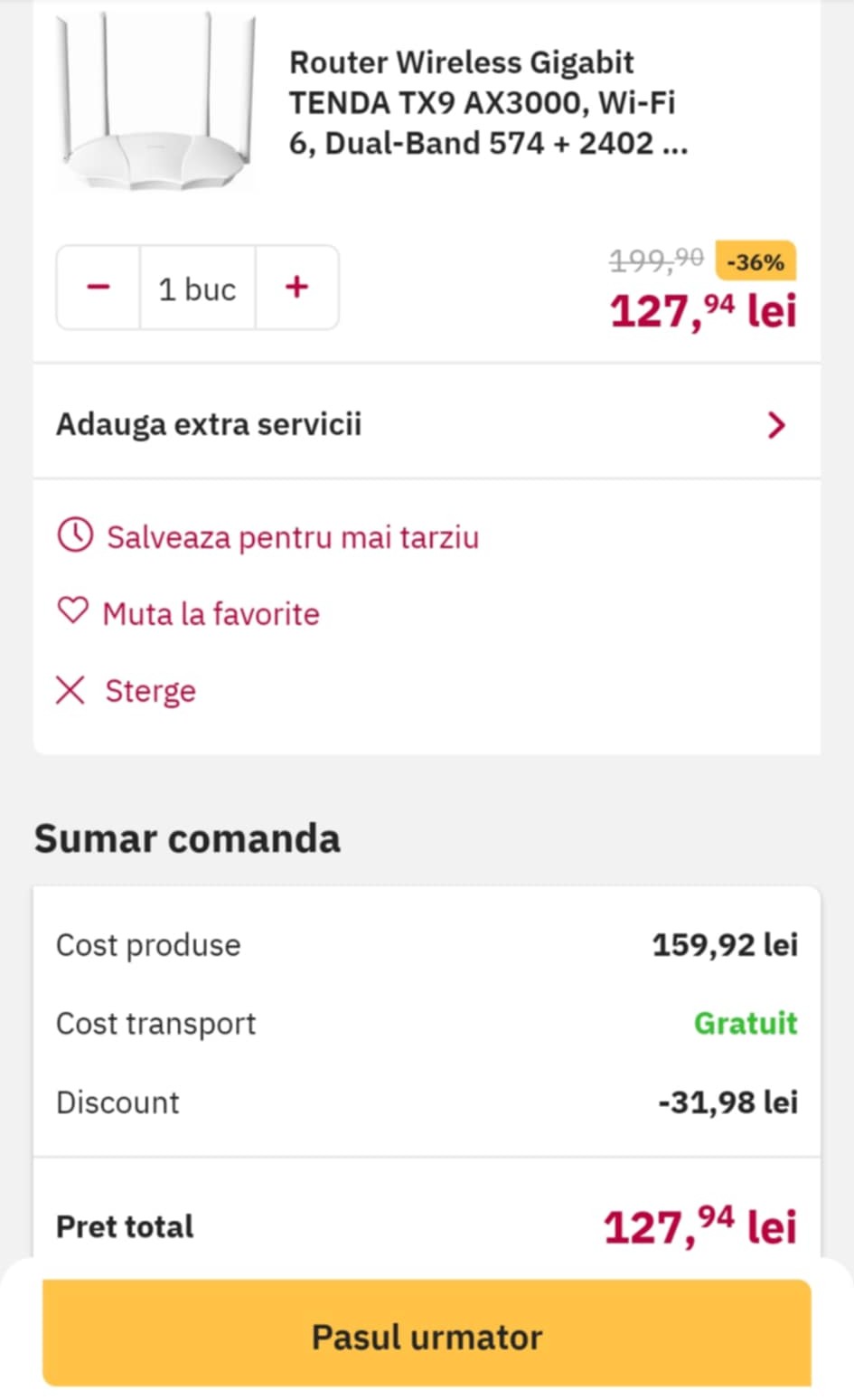 Pentru a beneficia de acest preţ foarte bun, trebuie să intraţi pe aplicaţia mobile a celor de la Altex, să selectaţi modelul de router, să îl adăugaţi în coş, iar la final să aplicaţi codul TENDA20APP (acesta este disponibil deja în secţiunea “adaugă extra cupoane”).