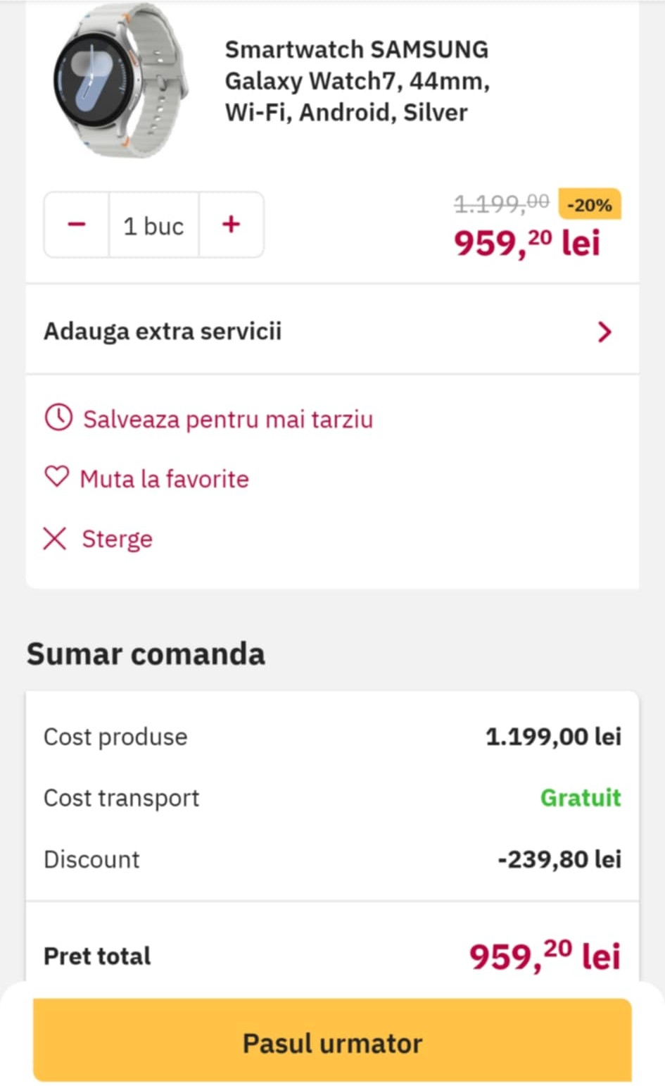 - Samsung Galaxy Watch7 de 44mm pe argintiu – 959.20 lei cu transport gratuit;
