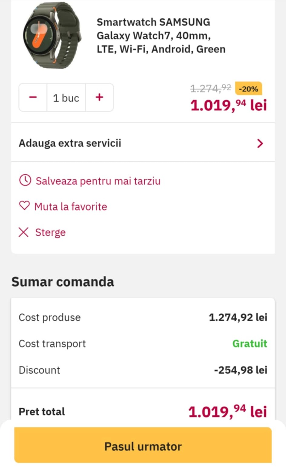 - Samsung Galaxy Watch7 4G LTE de 40mm pe verde – 1019.94 lei cu transport gratuit;