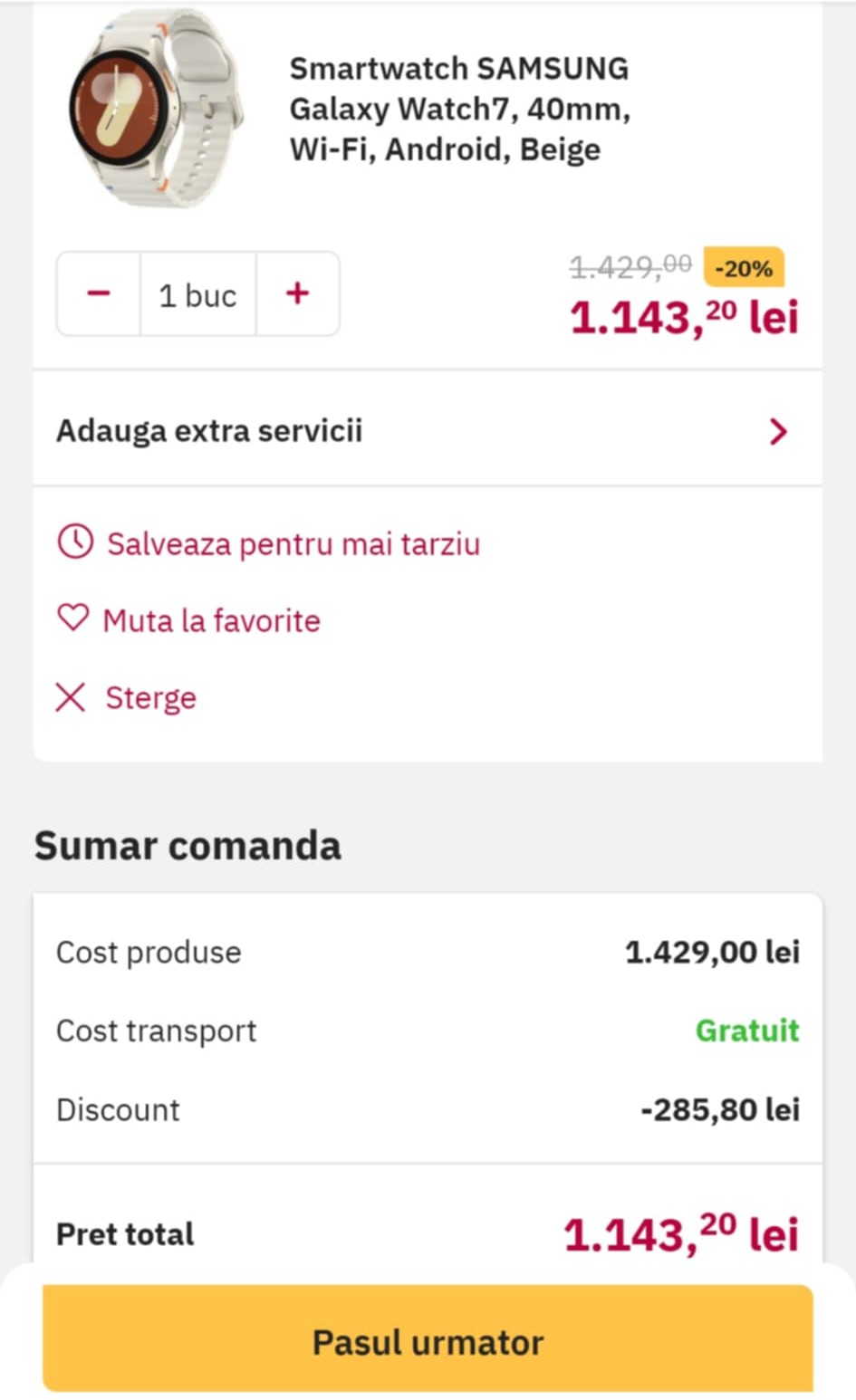 - Samsung Galaxy Watch7 de 40mm pe bej – 1143.20 lei cu transport gratuit;
