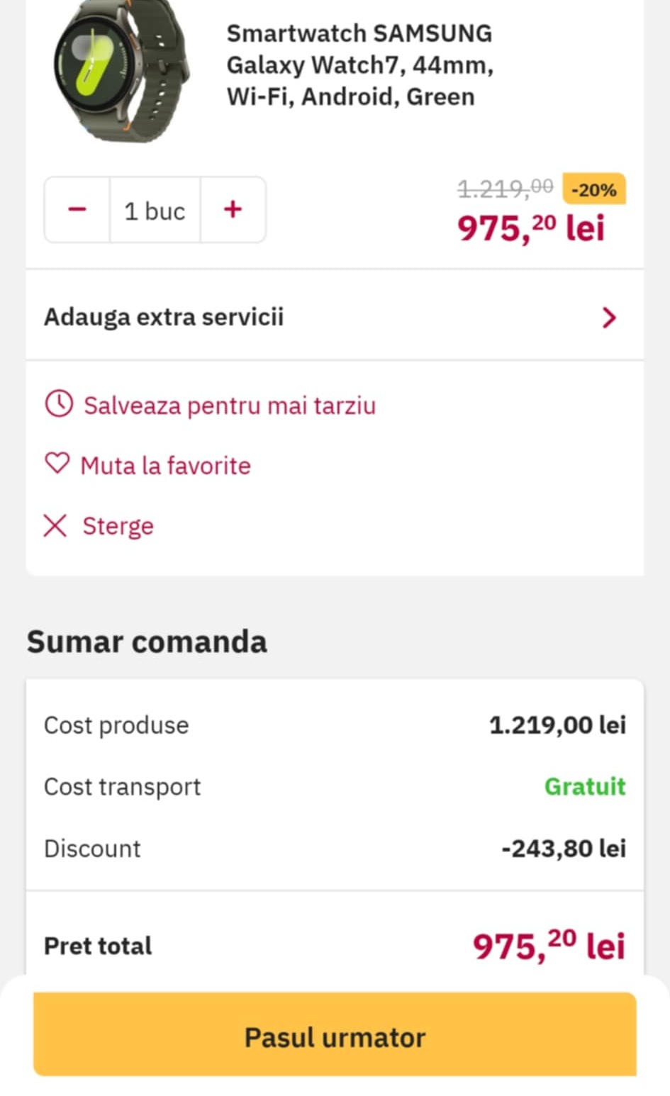 - Samsung Galaxy Watch7 de 44mm pe verde – 975.20 lei cu transport gratuit;