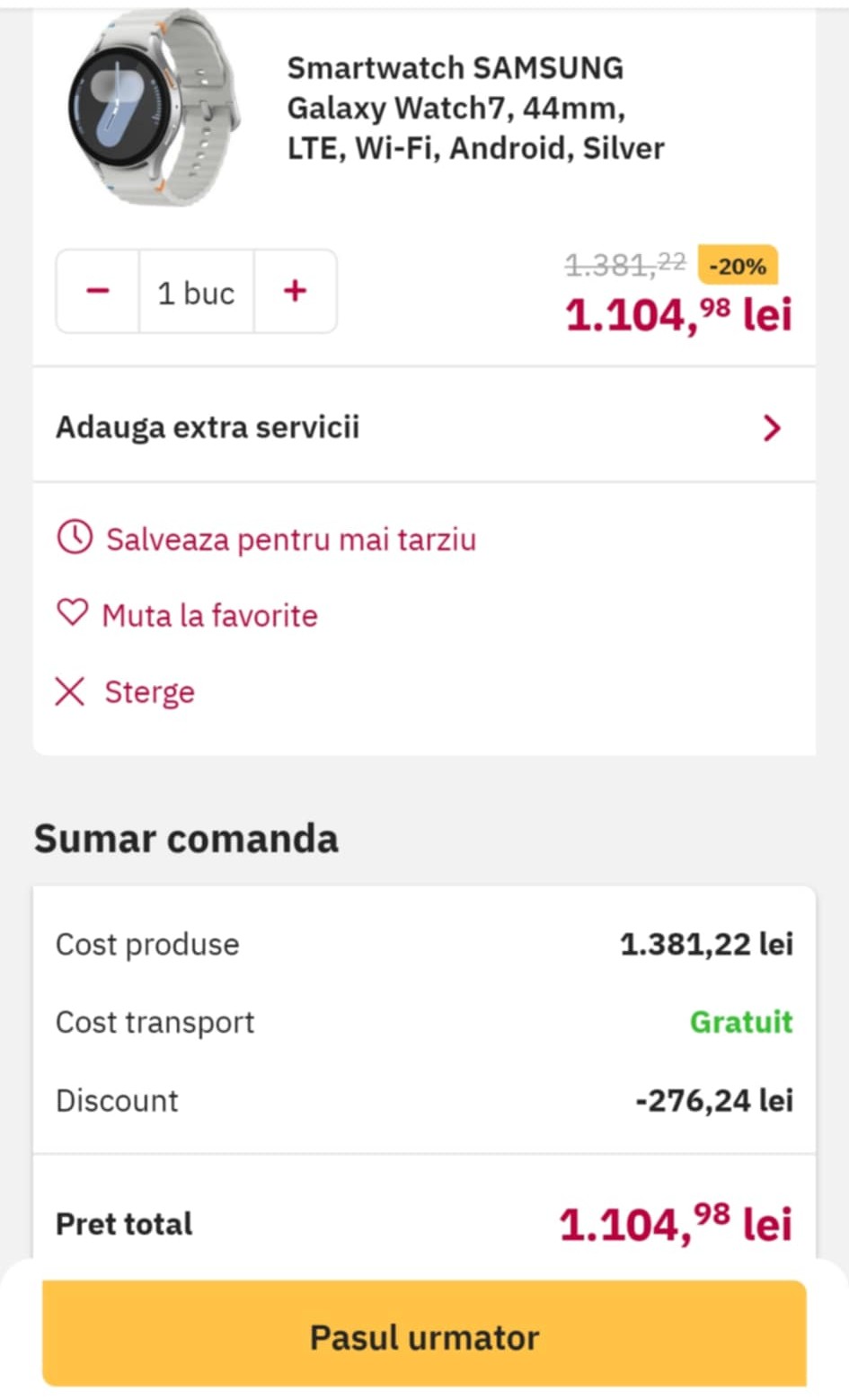 - Samsung Galaxy Watch7 4G LTE de 44mm pe argintiu – 1104.98 lei cu transport gratuit;