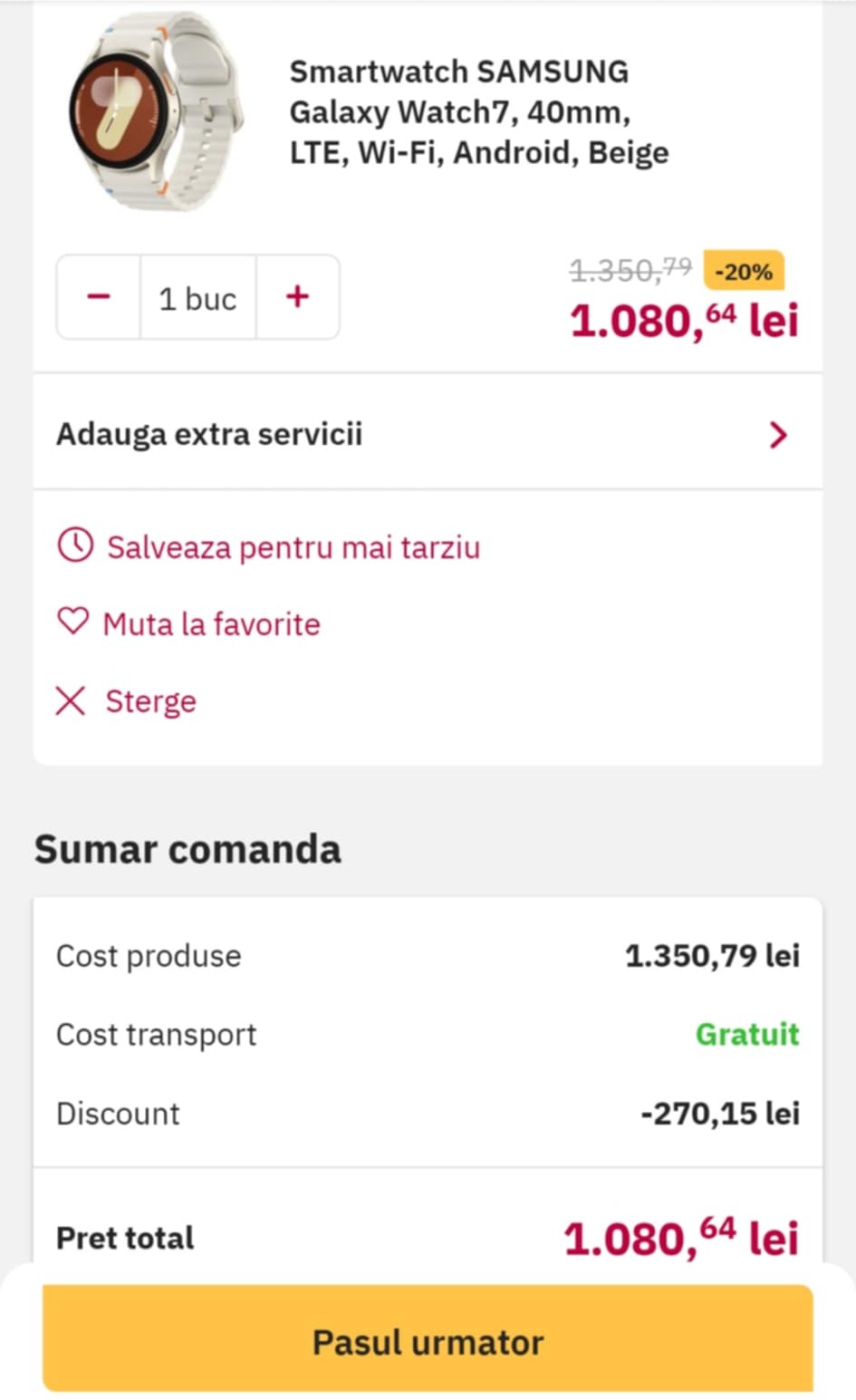 - Samsung Galaxy Watch7 4G LTE de 40mm pe bej – 1080.64 lei cu transport gratuit;