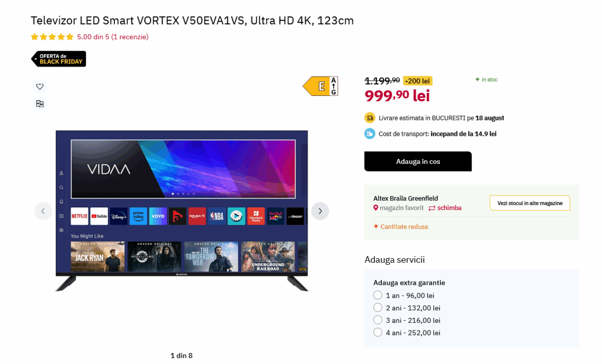 În această campanie promoţională am descoperit televizorul inteligent Vortex V50EVA1VS cu rezoluţie 4K şi diagonală de 123 cm ce costă doar 999.90 lei. Dacă îl comandaţi online cu ridicare din magazin sau vă duceţi direct în magazin, acesta este şi preţul final, iar dacă îl vreţi livrat acasă, mai plătiţi 14.90 lei pe transport.