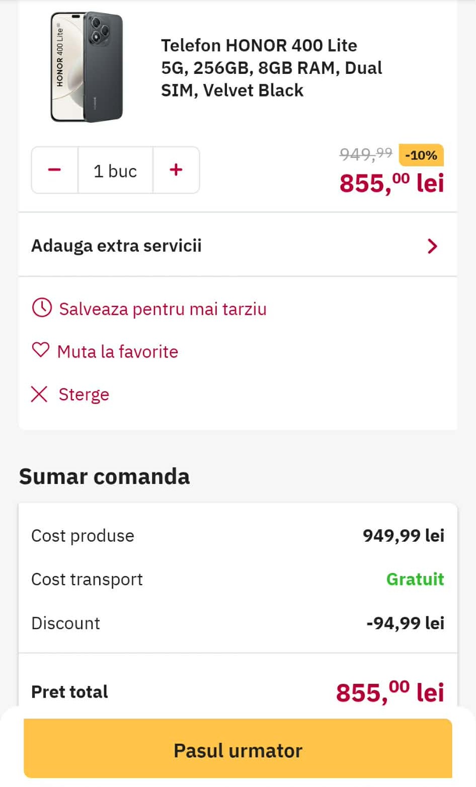 Până pe 24 decembrie inclusiv, deci aveţi suficient timp la dispoziţie să vă hotărâţi, puteţi cumpăra smartphone-ul Honor 400 Lite în orice variantă de culoare (negru, verde sau gri) la super preţul de 855 lei. Tot ce trebuie să faceţi este să intraţi în aplicaţia mobile a celor de la Altex, să alegeţi acest model, să aplicaţi codul PHONES10APP şi să alegeţi cu rezervare în magazin (dacă doriţi livrare acasă, mai scoateţi din buzunar încă 14.9 lei).