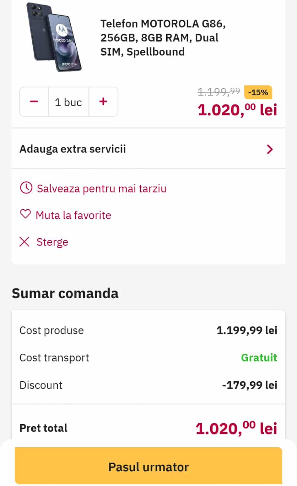 Pentru a beneficia de acest preţ, trebuie să intraţi în aplicaţie, să alegeţi smartphone-ul, să îl adăugaţi în coşul de cumpărături, să aplicaţi codul cupon MOTOROLA15APP (acesta este disponibil deja în secţiunea “adaugă extra cupoane”) şi la final să trimiteţi comanda.