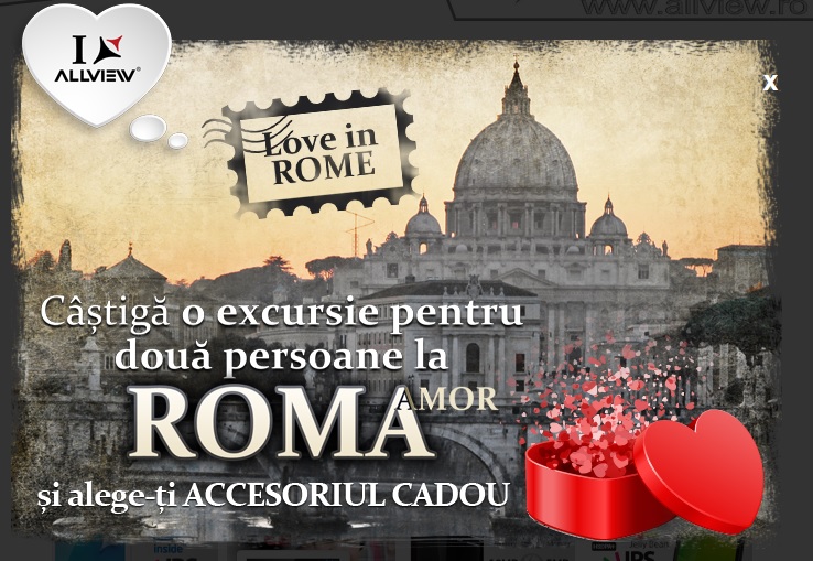Braşovenii de la Allview au o ofertă destul de drăguţă, dar care nu excelează din punct de vedere financiar. Cei care achiziţionează în perioada 11-17 februarie un produs Allview primeşte în mod gratuit un accesoriu şi este înscris automat într-o tombolă ce are ca premiu o excursie în doi la Roma în perioada 21-23 februarie.