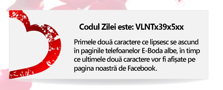 E-boda realizează un concurs destul de controversat, care a atras mai multe păreri negative pe pagina lor de Facebook. În fiecare zi vor publica un cod al zilei, care oferă o reducere substanţială pentru un anumit produs din portofoliu. Problema este că acest cod poate fi utilizat doar de o singură persoană, prima care îl descoperă (codul este format din mai multe litere şi cifre pe care le descoperi atât pe Facebook, cât şi pe site-ul e-Boda.ro).