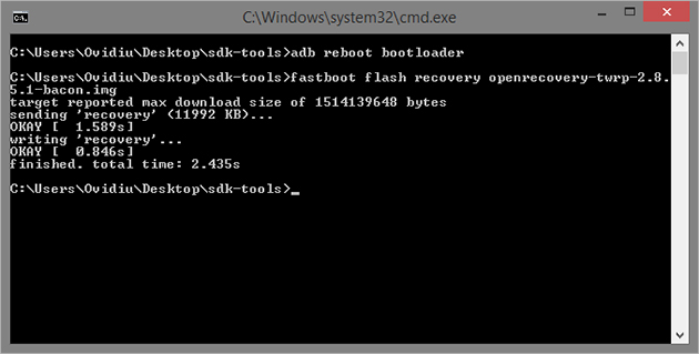 3.4. Odată ajuns în modul fastboot, execută comanda fastboot flash recovery openrecovery-twrp-2.8.5.1-bacon.img înlocuind openrecovery-twrp-2.8.5.1-bacon.img cu numele fișierului TWRP descărcat de tine, dacă este cazul. Fastboot va începe să scrie custom recovery-ul pe telefonul tău. Dacă totul a mers OK, vei primi un mesaj asemănător celui din imaginea de mai jos.