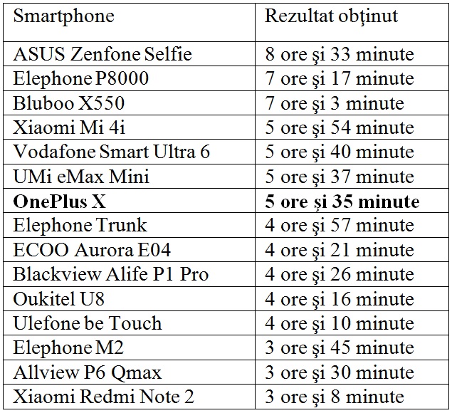 În testul nostru standard (luminozitate 100%, redare continuă a playlist-ului unboxing de pe canalul nostru de youtube şi conexiune Wi-Fi la internet), OnePlus X a obţinut un rezultat mediu: 5 ore şi 35 de minute. Avantajul acestui acumulator este însă încărcătorul de 2A care reuşeşte în 1h şi 45 de minute să îl ducă de la 0 la 100%.