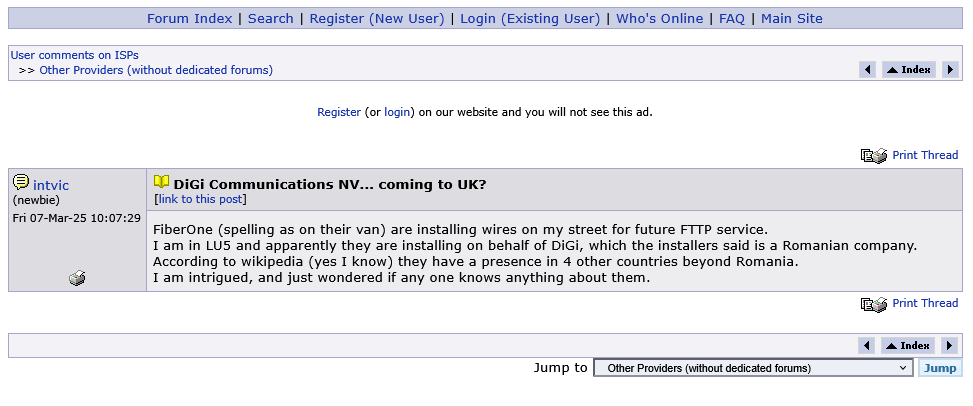 - pe 7 martie a apărut pe forumul specializat thinkbroadband.com un post în care un britanic povesteşte cum firma FiberOne instalează cabluri în numele DIGI în zona Luton;