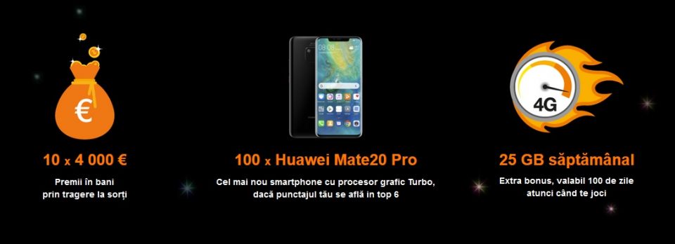 Puteţi câştiga bonus de internet pe mobil de până la 25 GB / săptămână, 10 premii în bani în valoare de 4000 euro fiecare sau unul dintre cele 100 de smartphone-uri Huawei Mate 20 Pro.