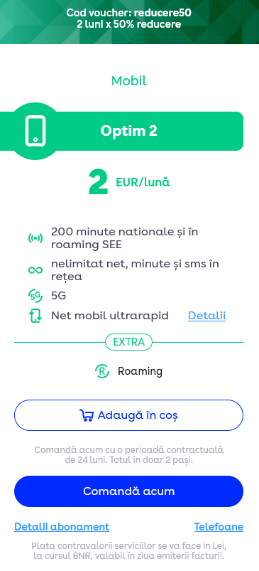 Cel mai bun abonament pentru portare mi se pare Optim 2. Pentru doar 2 euro / lună pe toată perioada contractuală (primele 2 luni au reducere de 50%) primiţi 200 de minute naţionale, 75 GB internet mobile la viteze 5G (ei zic că nelimitat, însă după cei 75 GB îţi este taiată rău viteza) şi 2.64 GB în roaming european.