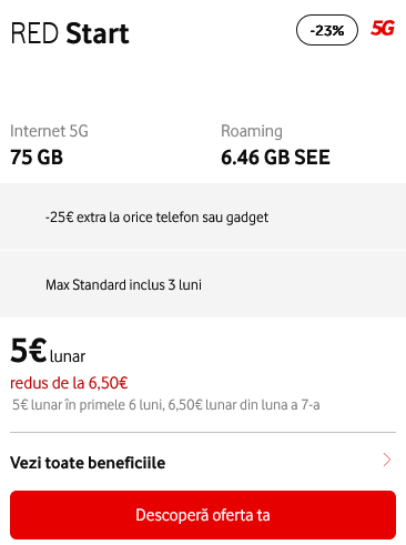 Cel mai bun abonament pentru portare mi se pare RED Start. Pentru 5 euro / lună în primele 6 luni şi 6.5 euro / lună în următoarele 18 luni, primiţi nelimitat minute şi SMS-uri naţionale, 75 GB internet mobile la viteze 5G, 6.46 GB în roaming european, 100 de minute internaţionale şi 3 luni de abonament Max gratuit.