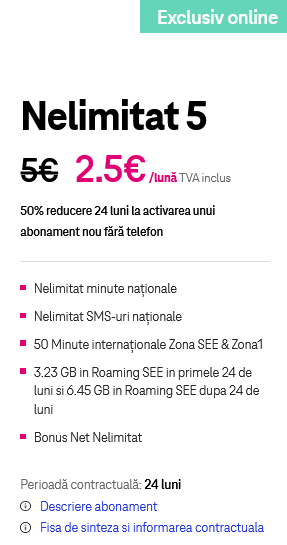 Cel mai bun abonament pentru portare mi se pare Nelimitat 5. Pentru doar 2.5 euro / lună pe toată perioada contractuală de 24 de luni primiţi nelimitat minute şi SMS-uri naţionale, nelimitat internet mobile la viteze 5G, 3.23 GB în roaming european şi 50 de minute internaţionale.