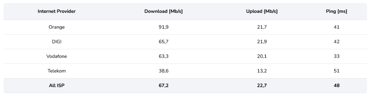 Orange a obţinut cea mai bună medie pe download (207.2 Mb/s) şi pe upload (159.8 Mb/s), în timp ce latenţa cea mai scăzută a fost obţinută de Digi (27 ms).