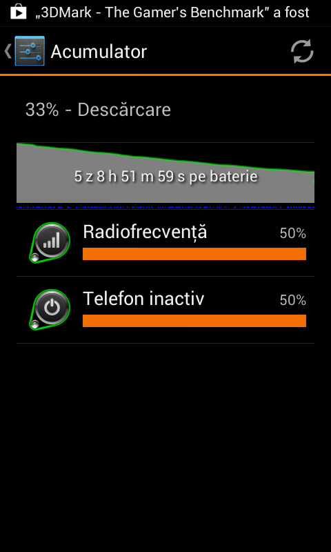 Cu display-ul pe luminozitate 50%, fără sincronizări și la o utilizare moderată a jocurilor, aplicațiilor, internetului vei ajunge a trece testul unei zile de utilizare. Dacă mergi pe luminozitate la maxim cu sincronizările în fundal și utilizare intensivă ai internetului via 3G, jocuri etc vei ajunge la sub 3 – 4h de funcționare.