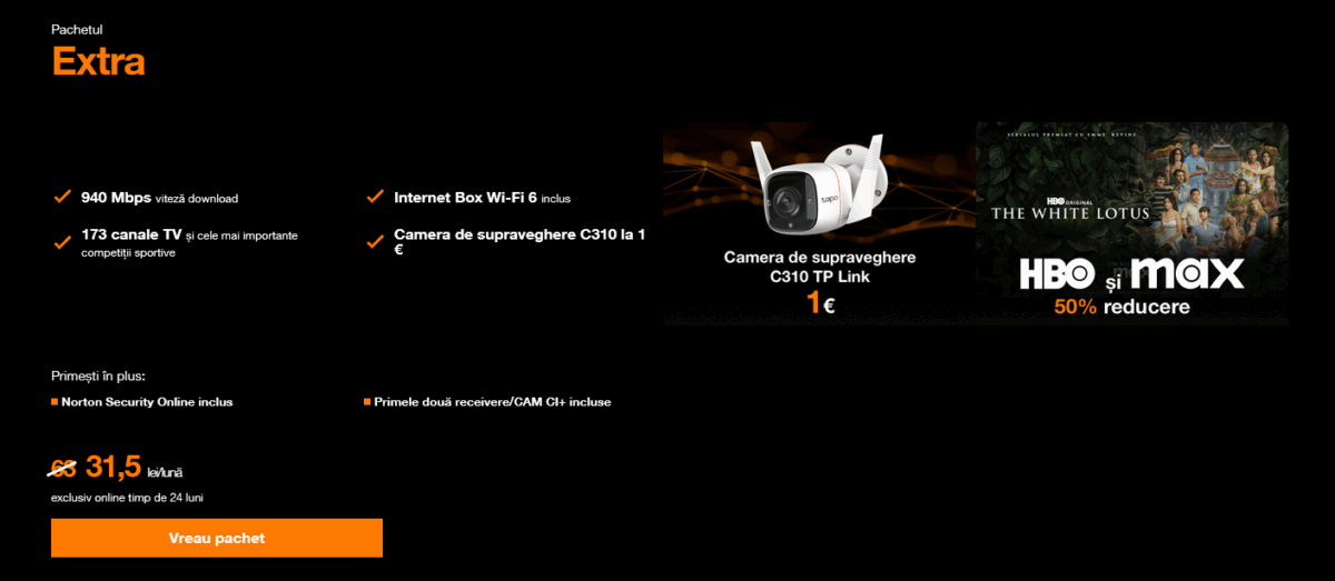 Operatorul portocaliu are o ofertă interesantă la pachetul de internet fix de mare viteză şi televiziune numit Orange Extra. Dacă alegeţi acest pachet online, primiţi o reducere de 50% timp de 24 de luni, adică pe toată perioada contractuală veţi plăti lunar 31.5 lei.