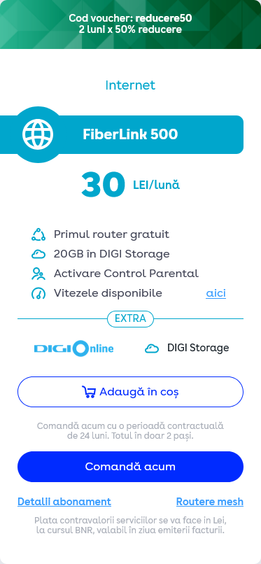 Preţul mi se pare excelent, iar dacă ne uităm în curtea liderului, DIGI, observăm că cel mai modest abonament de internet, FiberLink 500, costă 30 lei / lună (cu o reducere de 50% în primele 2 luni). Iar aici vorbim de viteze maxime de până la 500 Mbps.