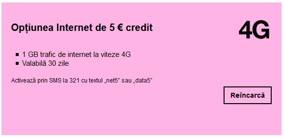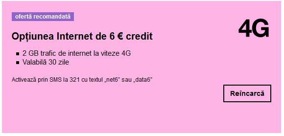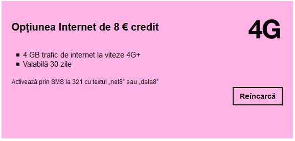 Dacă vă doriţi internet de mobil suplimentar, puteţi activa şi o extraopţiune de internet PrePay. Aici avem tot 4 variante şi tot pentru aceleaşi sume: 5, 6, 8 sau 10 euro. Activând o astfel de opţiune puteţi reporta până la maxim 30 GB internet pe mobil pentru o perioadă de 12 luni.