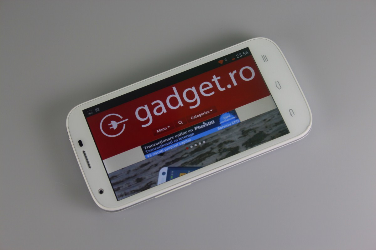 TFT LCD de 5 inch cu rezoluție 480×800 pixeli și ați fi înclinați să considerați că este un display de toată jena. Nu este cazul. Da. Știu. Ați dori pe 5 inch și o rezoluție HD, dar vă amintesc că vorbim de un telefon cu preț de 139 euro la liber. Nu m-a deranjat în browsing, pixeli nu se evidențiază atât de tare încât să nu-ți poți face sarcinile de zi cu zi pe el. Mi-a plăcut cum stă la capitolul luminozitate și la unghi de vizualizare, deși vorbim de o matrice TN. Cei 480×800 pixeli deranjează acut când începi a vizualiza clipuri via YouTube sau în format 720p. Mă rog, la suma investită mi se pare logic să faci și concesii.