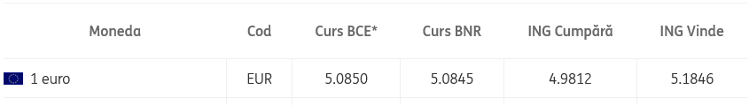 Cursul valutar utilizat va fi cel standard practicat de către ING Bank la vânzare pentru persoane fizice. Factura se va emite la cursul din ziua lucrătoare anterioară emiterii facturii.