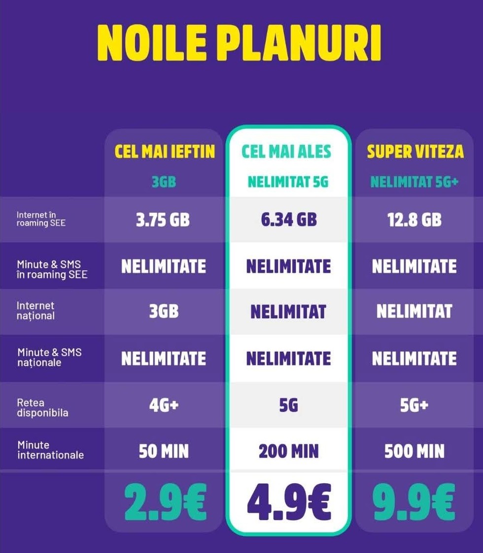 - YOXO SUPER VITEZA NELIMITAT 5G+ (nelimitat internet pe mobil 5G+ din care 12.8 GB în roaming SEE, minute şi SMS-uri naţionale nelimitate, 500 de minute internaţionale) – 9.9 euro / lună.