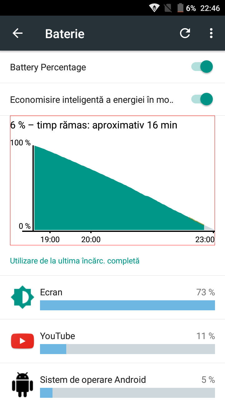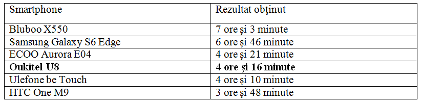 Oukitel U8 are o baterie de 2850 mAh care se descurcă onorabil. Cu luminozitatea la 50%, câteva apeluri, ceva sincronizări în fundal, mesaje, puțin browsing etc. trece lejer pragul a 24 de ore. În testul nostru (luminozitate 100%, redare continuă a playlist-ului unboxing de pe canalul nostru de youtube şi conexiune Wi-Fi la internet) a ajuns de la 100% la 5% în 4 ore şi 16 minute.
