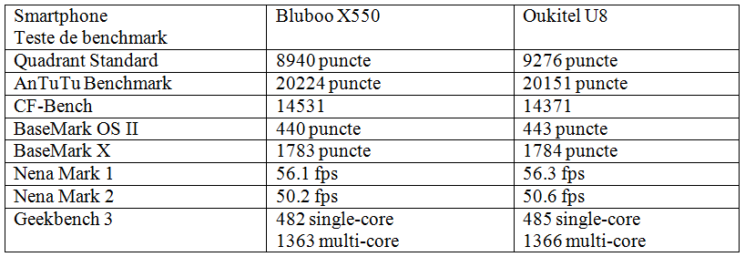 Oukitel U8 a fost trecut prin câteva teste de benchmark, iar rezultatele le-am comparat cu cele obţinute de Bluboo X550 (au aproximativ aceeaşi configuraţie hardware).