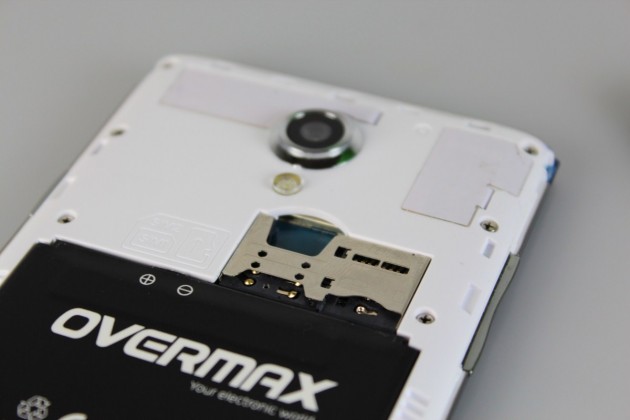Overmax Vertis AIM este un telefon dual-SIM ce acceptă un microSIM și unul de dimensiuni normale. Pe lângă acestea, smartphone-ul mai dispune și de un slot pentru carduri microSD de până la 32 GB.La nici unul dintre aceste trei elemente de conectivitate nu avem acces fără a scote acumulatorul.
