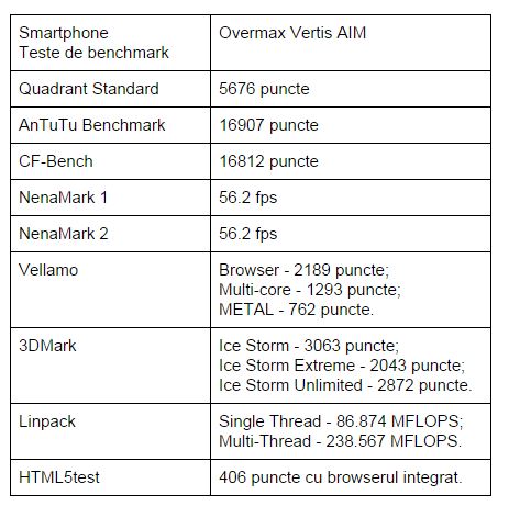 Pentru un smartphone cu specificațiile lui Overmax Vertis AIM, cei 2600 mAh oferiți de acumulator ar fi trebuit să fie suficienți. Totuși, nu este chiar așa. Adică, dacă îl folosești non-stop cu luminozitatea la maxim, mai mult de 6-7 ore nu duce. Folosit normal, cu câteva apeluri (dacă reușești să te înțelegi cu partenerul de discuții), sincronizări în fundal, o oră de jocuri, o oră – o oră și jumătate de internet, câteva poze făcute și videoclipuri urmărite, ajungi seara să mai ai ceva energie rămasă în baterie. Nu multă!
