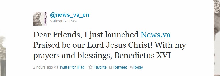 Şi a pus un prim tweet de pe contul news_va_en. Papa Benedict al XVI-lea a mers pe calea marelui său înaintaş şi a ancorat puternic biserica catolică în cele mai noi tehnologii şi acum în social media. Au şi cont de facebook, de youtube şi vedeţi că din când în când postează şi pe twitter de pe iPad.