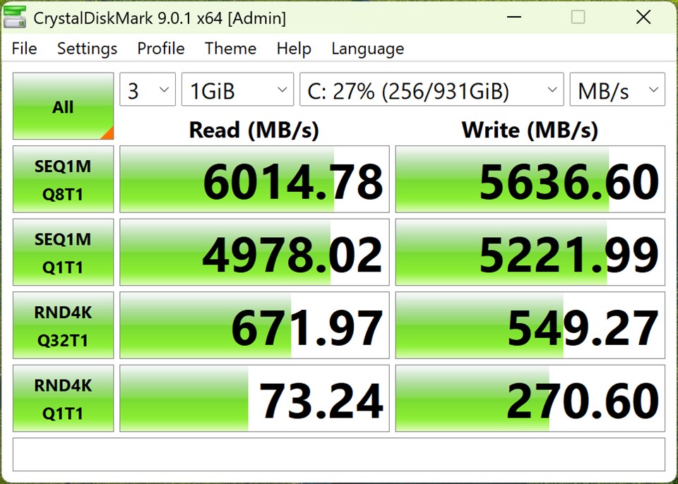 | CrystalDiskMark (MB/s) SEQ1M Q8T1 Read Write SEQ1M Q1T1 Read Write RND4K Q32T1 Read Write RND4K Q1T1 Read Write | 6014.78 5636.60 4978.02 5221.99 671.97 549.27 73.24 270.60 |